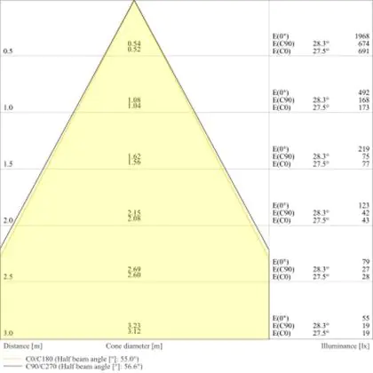 De lichtopbrengst en de gradenbundel spelen een grote rol. Zo geeft de lichtopbrengst van 540 Lumen in combinatie met de 60° stralingshoek deze inbouwspot een specifieke toepassing. Kort samengevat is een lichtintensiteit van maximaal 400 Lumen ideaal voor accentverlichting, terwijl hogere waardes goed gebruikt kunnen worden als basisverlichting. Over het algemeen geldt: hoe breder de gradenbundel, hoe geschikter deze is door basisverlichting. Dit komt doordat het licht over een groter oppervlak wordt verspreid. Smallere gradenbundels (tot 40°) kunnen echter bij hoge plafonds ook goed tot hun recht komen als algemene verlichting.