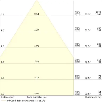 De lichtopbrengst en de gradenbundel spelen een grote rol. Zo geeft de lichtopbrengst van 560 Lumen in combinatie met de 60° stralingshoek deze inbouwspot een specifieke toepassing. Kort samengevat is een lichtintensiteit van maximaal 400 Lumen ideaal voor accentverlichting, terwijl hogere waardes goed gebruikt kunnen worden als basisverlichting. Over het algemeen geldt: hoe breder de gradenbundel, hoe geschikter deze is door basisverlichting. Dit komt doordat het licht over een groter oppervlak wordt verspreid. Smallere gradenbundels (tot 40°) kunnen echter bij hoge plafonds ook goed tot hun recht komen als algemene verlichting.