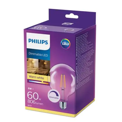Beschrijving Philips Classic LED Globe E27 Filament Helder 120mm 8W 806lm - 827 Zeer Warm Wit | Dimbaar - Vervangt 60W