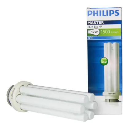 De Philips PL-R Eco 4P zijn bijzonder geschikt voor ruimtes waar verlichting dag en nacht brand. De Philips PL-R Eco 17W 830 4P (MASTER) lamp heeft een lengte van 15 cm en heeft een GR14q-1 lampvoet, wat overeenkomt met 4 pinnen. De lamp is met energielabel A is geclassificeerd. De lampen hebben een zeer lange levensduur, namelijk 24000 branduren!